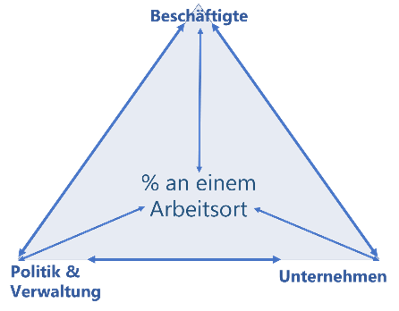 - Die Entwicklung einer partizipativen Bewertungs- und Handlungssystematik für die Entscheidungsfindung unter Beteiligung von Beschäftigten und Unternehmen im Kontext hybrider Arbeitsformen und -orte,